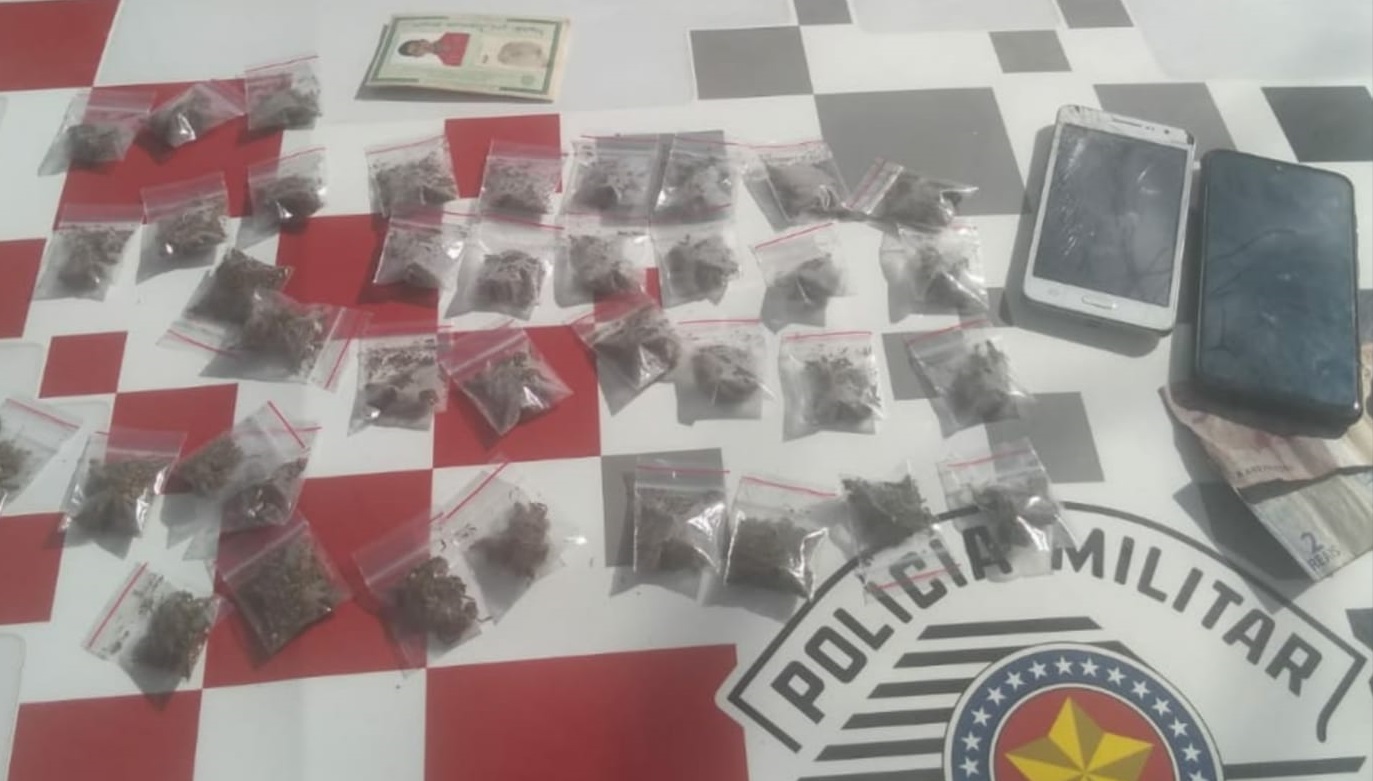 Os policiais fizeram a abordagem e observaram que algo havia sido arremessado pela janela. O objeto foi recuperado e continha cinco porções de maconha. No veículo havia mais 14 porções da mesma droga e R$ 170.