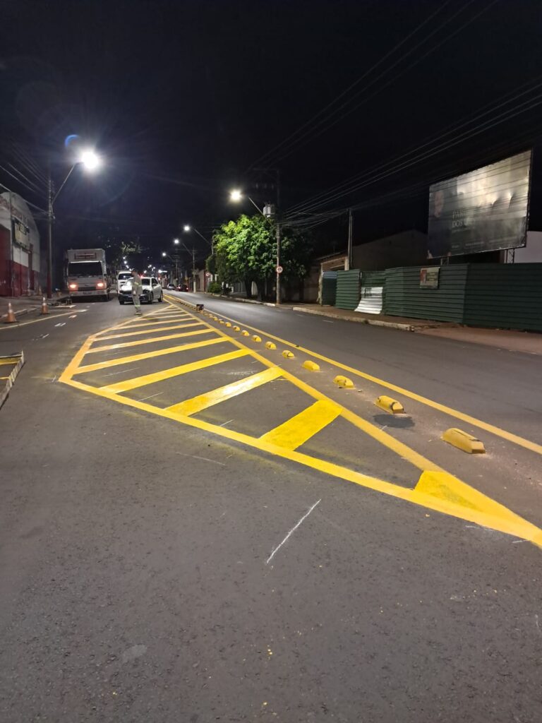 A Subsecretaria de Trânsito concluiu, na madrugada desta quarta-feira (11), a primeira etapa da pintura da nova faixa de conversão à esquerda na avenida Tamoios, no cruzamento com a rua Tocantins, no sentido Centro–bairro, em Tupã.