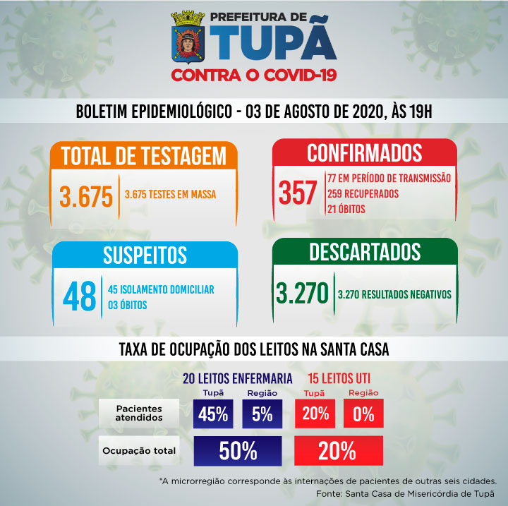 A taxa de ocupação hospitalar da UTI caiu para 20%. Já a taxa de ocupação da enfermaria diminuiu para 50%, com 45% de pacientes de Tupã e 5% de pacientes da região.