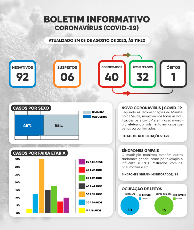 Bastos contabiliza 40 testes positivos da doença, sendo um morte e 32 considerados recuperados. Seis casos suspeitos estão em investigação.