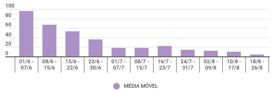 De 1º a 7 de junho, a média de positivados ficou em 96,71 contra 4,14 casos por dia entre 18 e 26 de agosto.