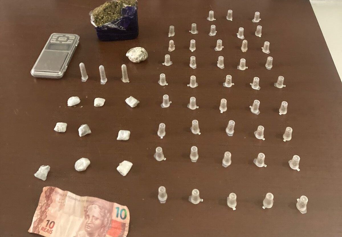 Após a abordagem, a equipe se deslocou até a residência, onde encontraram diversos itens relacionados ao tráfico de drogas, como uma balança de precisão, meio tablete de maconha, nove porções de maconha embaladas em plástico filme, uma porção maior da erva também embalada em plástico filme, 43 pinos pequenos e três pinos grandes de droga sintética.