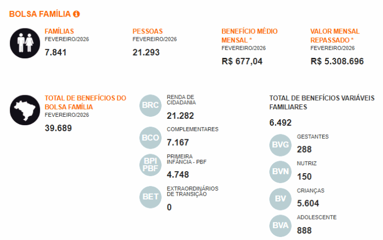 O levantamento aponta ainda que o município contabiliza 39.689 benefícios pagos dentro da estrutura do Bolsa Família, incluindo diferentes modalidades. Entre eles estão 21.282 benefícios de renda de cidadania, 7.167 benefícios complementares e 4.748 destinados à primeira infância.