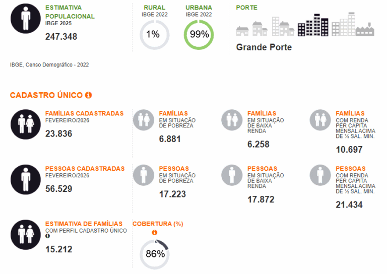 O sistema reúne 56.529 pessoas cadastradas no município, em um universo populacional estimado em 247.348 habitantes, conforme o Censo 2022 do IBGE.