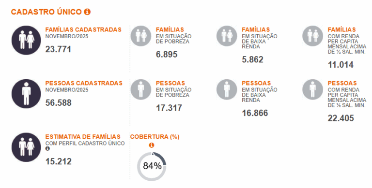 Dados deste mês, divulgados pelo Ministério do Desenvolvimento e Assistência Social, Família e Combate à Fome, mostram que ao menos um em cada cinco moradores do município vive em situação de vulnerabilidade e depende diretamente de políticas públicas para garantir renda, alimentação, acesso a serviços e acompanhamento familiar.