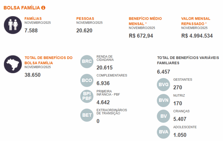 O Bolsa Família permanece entre os principais instrumentos de proteção social no município. Em novembro, 7.588 famílias receberam o benefício, que alcançou 20.620 pessoas, com valor médio de R$ 672,94. O repasse federal no mês totalizou R$ 4.994.534.