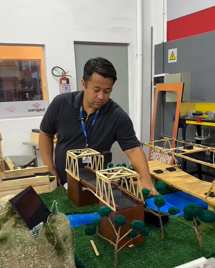 Outros grupos apresentaram soluções como pontes com eixo central giratório controlado por Arduino, estruturas com sistemas de elevação, sinalização luminosa simulando semáforos e projetos com acabamento detalhado, incluindo água cenográfica, paisagismo e elementos artísticos. “Tivemos grupos que utilizaram maquinário para dar acabamento à madeira, outros que trabalharam a estética com montanhas, árvores e cenários urbanos, mostrando que a engenharia também dialoga com o design e a sensibilidade visual”, disse o coordenador.