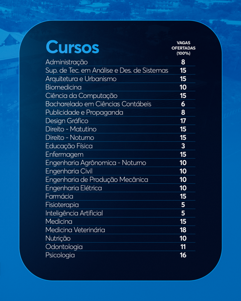 No campus de Marília, a Unimar oferece 277 bolsas integrais para cursos presenciais em diversas áreas, como Administração, Direito, Medicina, Psicologia e Engenharia. Entre os destaques estão os cursos de Medicina, com 15 bolsas, Medicina Veterinária, com 18 vagas, e Direito, com 30 bolsas divididas entre os períodos matutino e noturno.