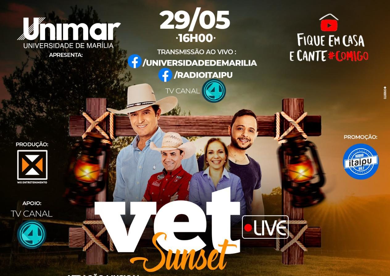 O curso de Medicina Veterinária da Universidade de Marília (Unimar) realiza nesta sexta-feira, dia 29 de maio, a partir das 16h, a “Vet Live Sunset”, uma ação solidária que contará com a participação da dupla sertaneja Jad e Jefferson, a Pró-reitora de Pesquisa, Pós-graduação e Ação Comunitária da Unimar, Fernanda Mesquita Serva, o Coordenador das Fazendas, Júlio César Mesquita Serva Mascaro Simões e os docentes, Fábio Manhoso, Marcílio Félix e Rodolfo Spers. O evento será apresentado pelo locutor Joca e a jornalista Leniza Almeida, com transmissão ao vivo pela página oficial da Unimar no facebook e pela TV Canal 4.