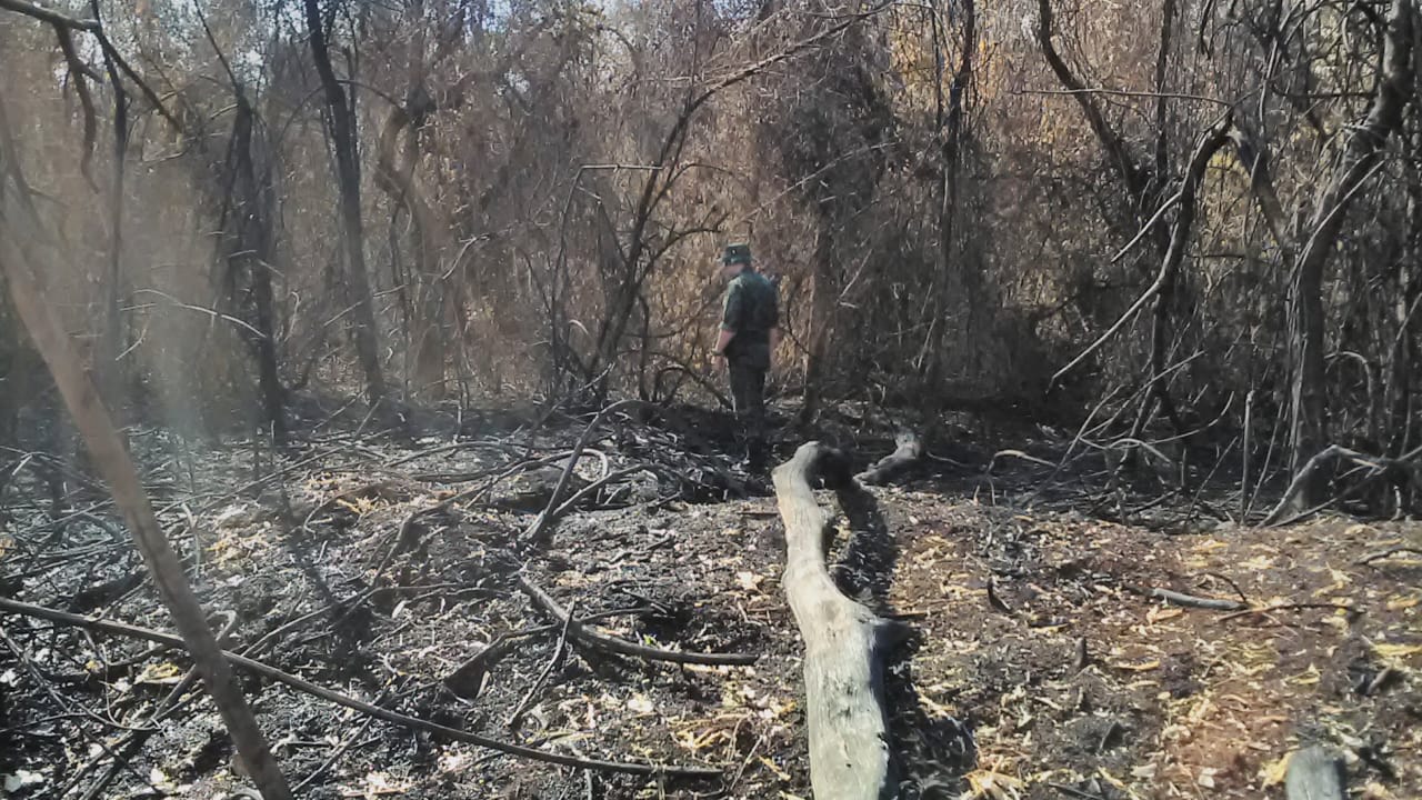 Foi constatado um maciço florestal, atingido pelo fogo, que teve início em uma plantação de cana de açúcar, queimando uma área de 8,5 hectares de reserva legal.