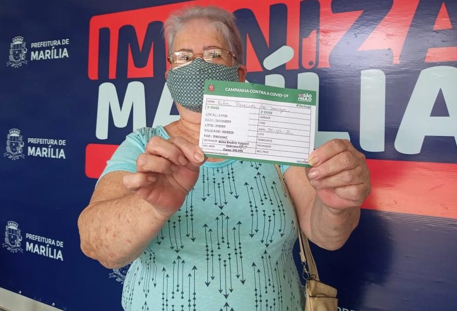 “Pronto, dona Rita. Guarda bem o cartão de vacina e até a próxima”. As palavras da profissional de enfermagem tiraram da aposentada Rita Pereira de Souza, de 74 anos, um largo sorriso, perceptível mesmo sob as duas máscaras – uma cirúrgica e outra de tecido. A idosa foi uma das 2,5 mil pessoas vacinadas pela Secretaria da Saúde de Marília neste sábado (20).