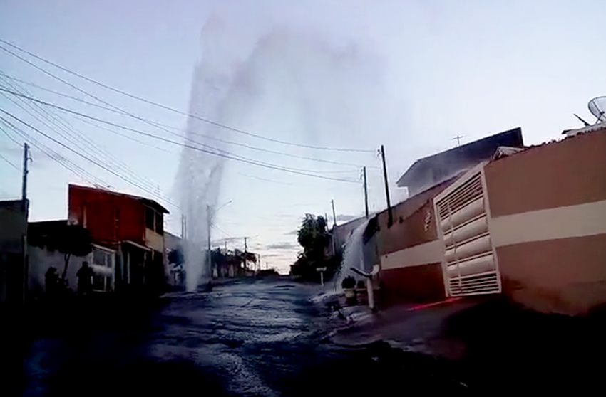 O rompimento da tubulação aconteceu na noite de ontem (20) e até o final da manhã de hoje o problema ainda não havia sido sanado. O “chafariz” na rua José Batista de Almeida Sobrinho pode ser visto de longe e a força da água é tão grande que chegou a atingir a rede elétrica.