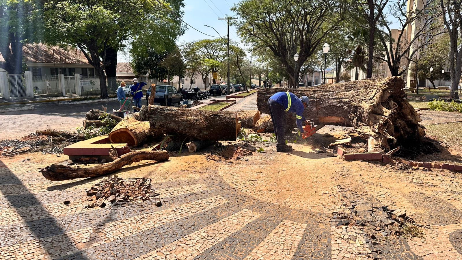 Neste momento, os profissionais concentram esforços na avenida Sete de Setembro, onde os estragos foram mais severos. Com o uso de serras elétricas, as equipes cortam os tocos de árvores que caíram durante a tempestade. Na sequência, os trabalhadores irão reparar as pedras portuguesas da praça, que foram danificadas.