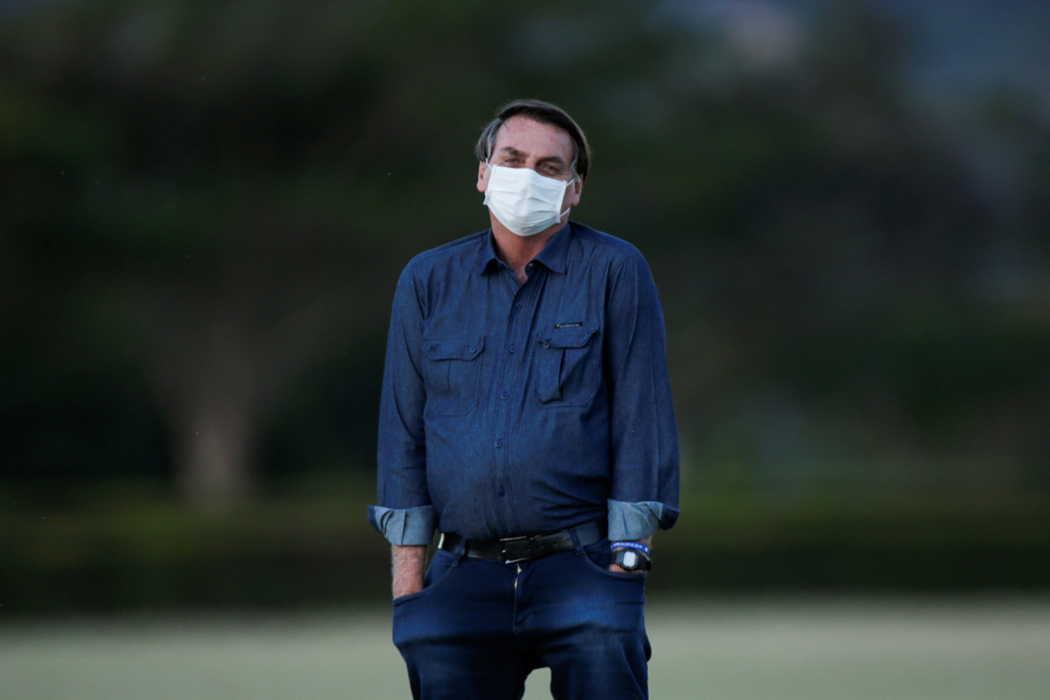 Brazil's President Jair Bolsonaro observes a ceremony to lower the Brazilian National flag down for the night, at the Alvorada Palace, amid the coronavirus disease (COVID-19) outbreak, in Brasilia, Brazil, July 15, 2020. REUTERS/Ueslei Marcelino