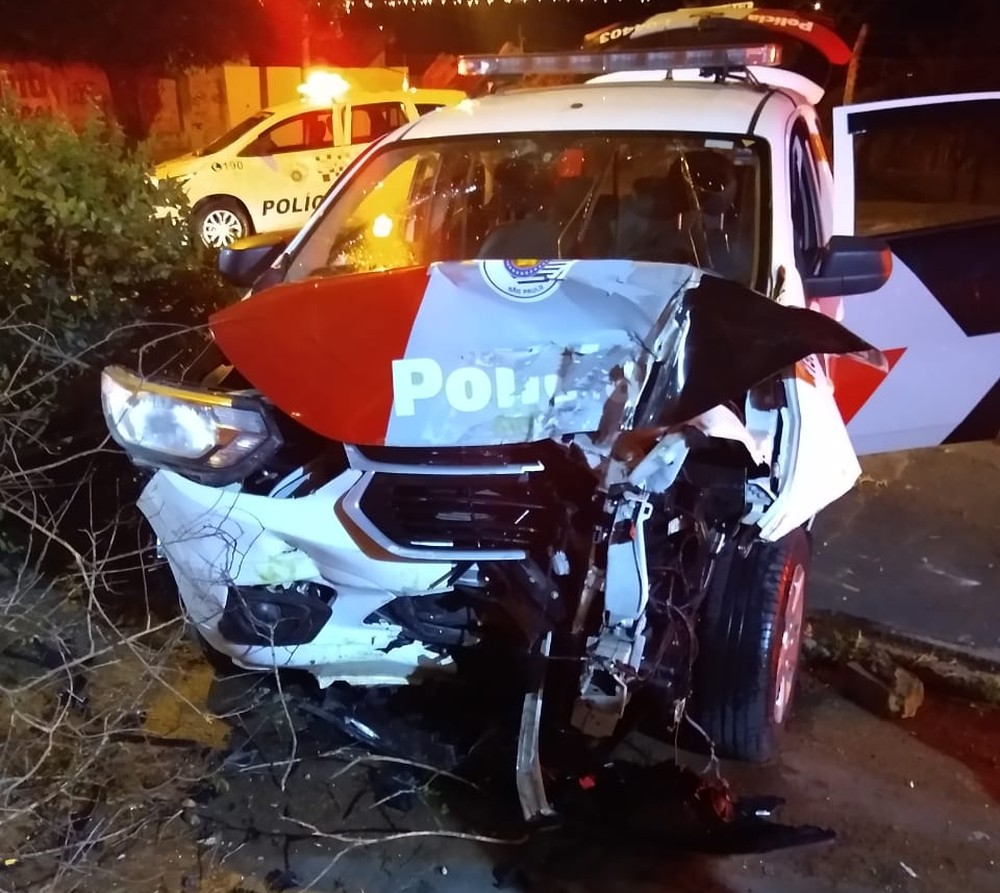 Durante a perseguição, uma viatura da PM bateu em uma árvore e outro veículo prosseguiu no encalço dos suspeitos.