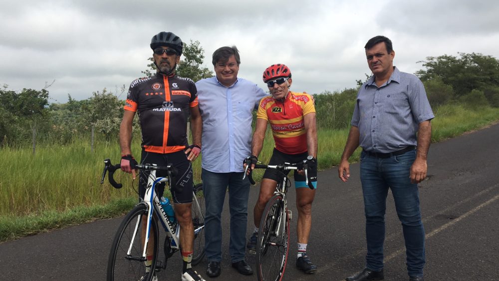 Prefeito Daniel Alonso e vereador Evandro Galete com ciclistas na vicinal Marília/Avencas em julho de 2018 (Foto: Divulgação)
