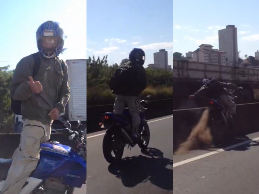 O vídeo mostra a irresponsabilidade de um motociclista, que fica em pé na moto e acaba perdendo o controle do veículo, que bate contra a mureta que divide as pistas.