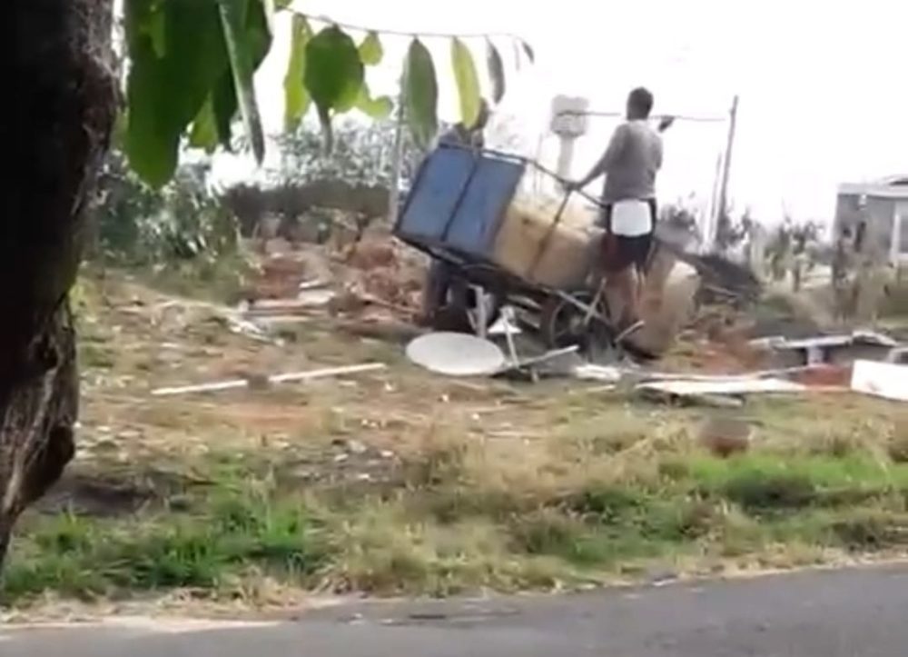 Nas imagens aparecem dois homens selecionando os materiais dentro de um carrinho. Os itens que não interessavam eram depositados no terreno.