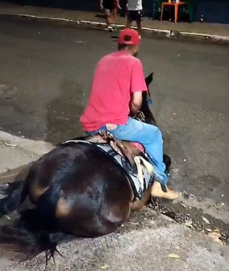 Segundo o relato, a entidade recebeu denúncias e imagens gravadas por pessoas que presenciaram a situação. No vídeo, um homem vestindo camiseta vermelha e boné tenta montar repetidamente no cavalo, que demonstra claros sinais de exaustão e dificuldade para permanecer em pé.
