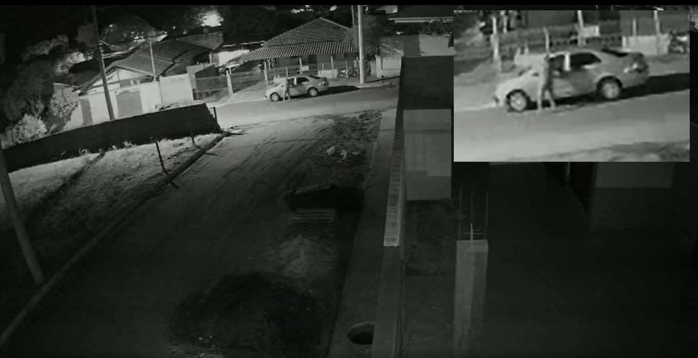 O homem encapuzado foi flagrado por câmeras de vigilância de uma residência no momento do crime. O veículo que pertence a uma servidora municipal ficou destruído. A Polícia Civil apura o caso.