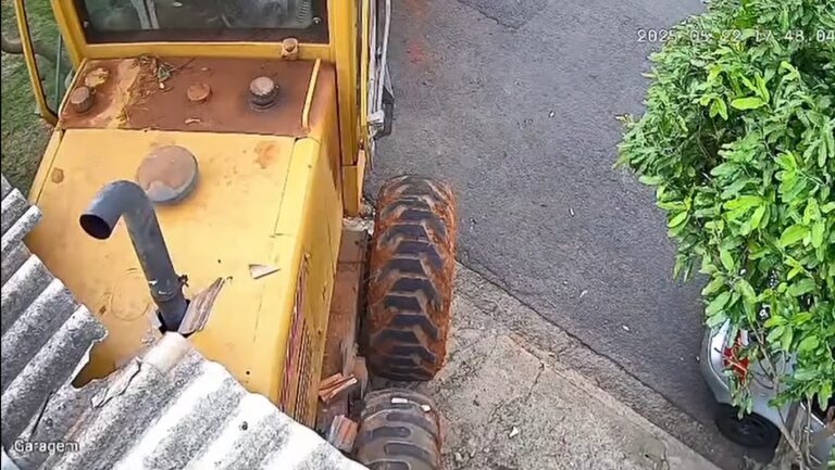 O incidente aconteceu quando o equipamento, que era utilizado em obras na região, avançou sem controle sobre o imóvel. Imagens de uma câmera de segurança mostram a aproximação e impacto.