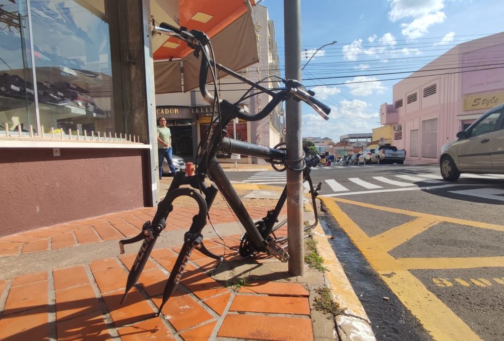 Internautas que passaram pelo cruzamento, na região central, fizeram fotos da cena. Só restam o quadro, o “garfo” e algumas poucas peças da bicicleta. As rodas, selim e canote foram removidos no início da semana.