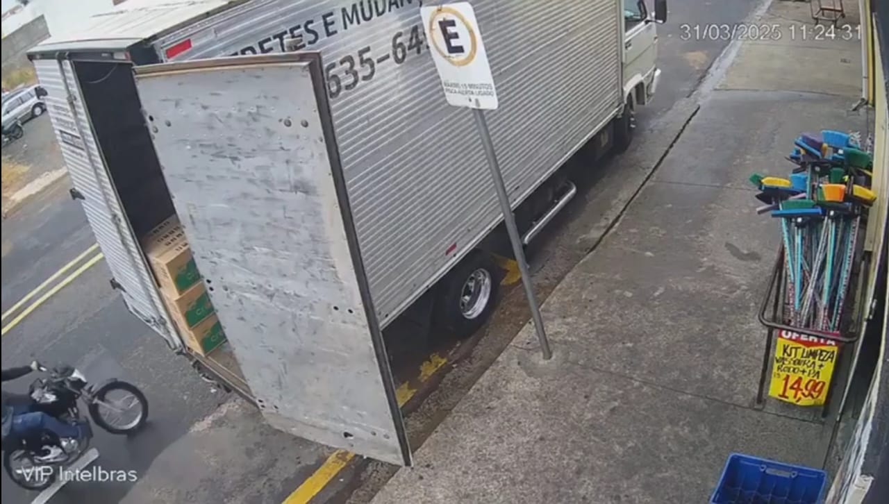 As imagens são impactantes: o motociclista atinge com força a traseira do caminhão e cai imediatamente, aparentemente já sem vida. A motocicleta ficou presa na parte traseira do veículo.