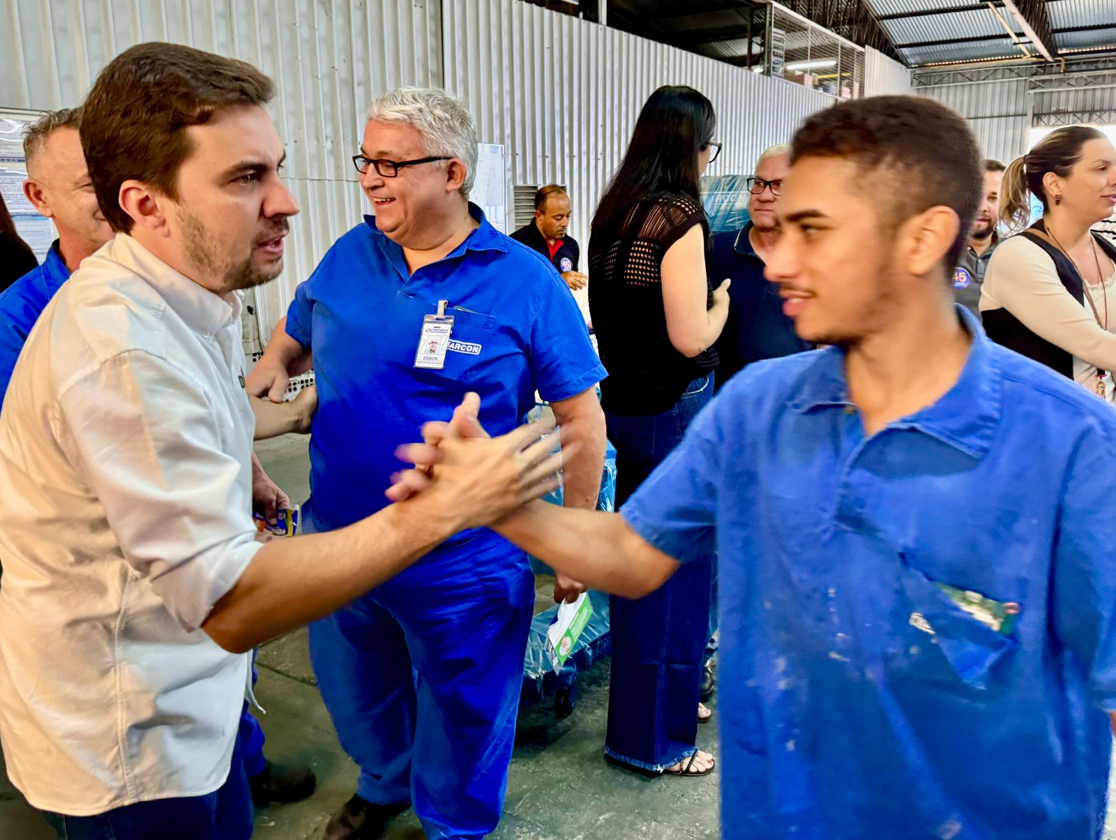 Vinicius afirma que tem mantido contato com os trabalhadores para fortalecer o Distrito Industrial e gerar ainda mais empregos em seu governo. Funcionários de duas indústrias ouviram as propostas do candidato.