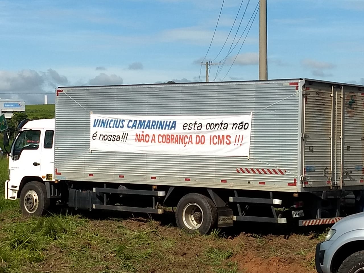 Com faixas, os produtores reivindicaram e protestaram contra o deputado. “Vinicius Camarinha esta conta não é nossa! Não a cobrança do ICMS”, diz uma das faixas.