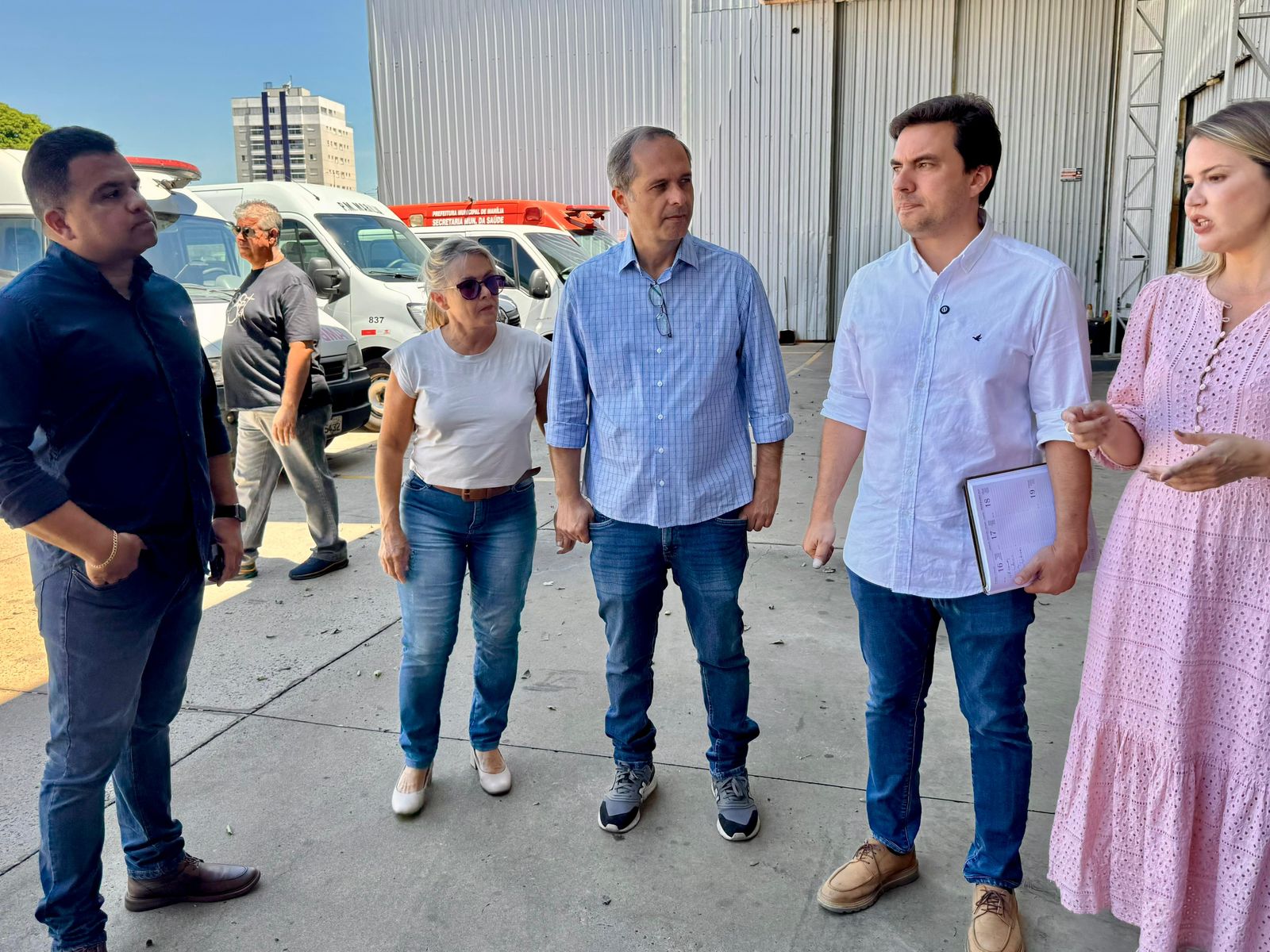 O prefeito Vinicius Camarinha (PSDB) visitou a sede administrativa da Secretaria Municipal da Saúde e a Central de Ambulâncias na manhã desta segunda-feira (13), acompanhado da secretária municipal, Paloma Libânio; do presidente da Câmara Municipal, Danilo Bigeschi (PSDB); e da presidente do Fundo Social de Solidariedade, Maria Paula Almeida.