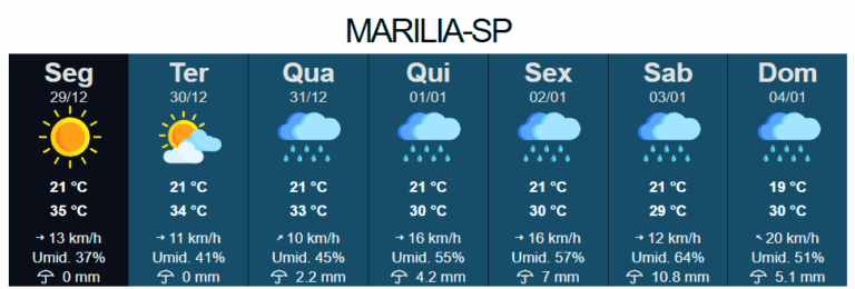 A virada de ano em Marília deve ser marcada por chuva e temperaturas elevadas, segundo dados do Instituto de Pesquisas Meteorológicas (IPMet) de Bauru, com base em imagens de satélite e modelos atualizados.