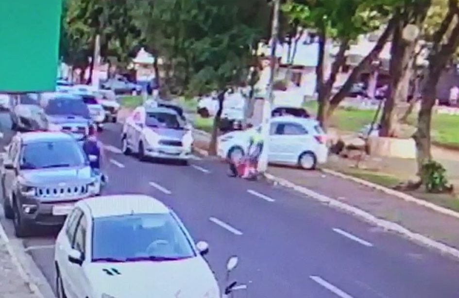 Câmeras de segurança registraram a agressão, as imagens são fortes. O autor fugiu e a vítima foi socorrida por populares.